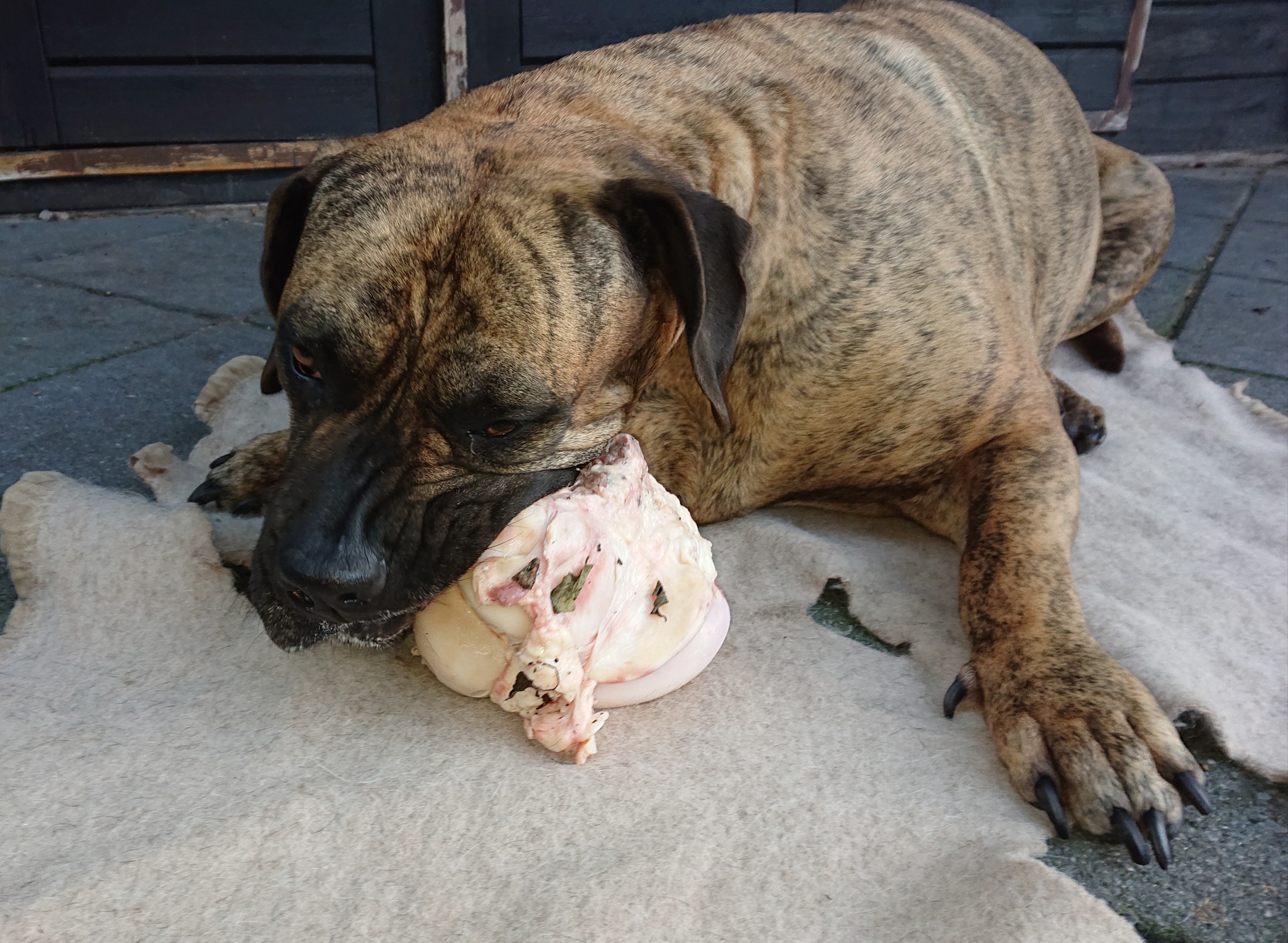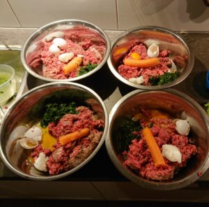 Wij voeren onze honden brokken (Royal Canin in de ochtend) en vers vlees in de avond, vaak aangevuld met groenten. In het weekend verwennen wij de honden extra met BARF, dat kan verschillen tussen knotsen, ribben, kipkarkassen of schapenkoppen. Hier genieten onze honden allen van, maar daarbij is het ook zeer goed tegen tandsteen en gebruiken ze hun kaakspieren waar ze voor dienen.